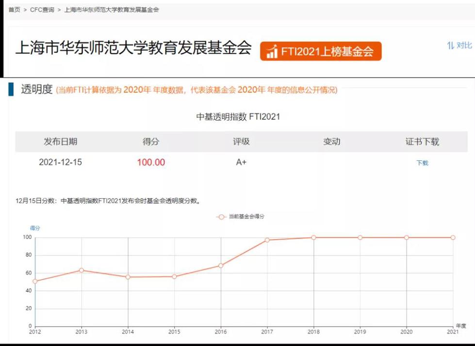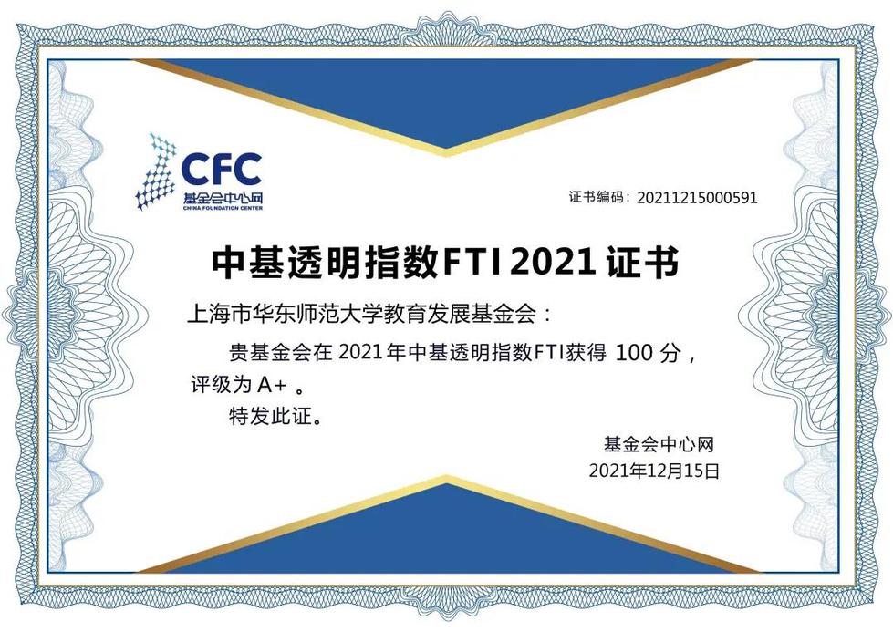2021年12月15日,基金会中心网发布“中基透明指数FTI2021”榜单,华东师范大学教育发展基金会获得100分,透明等级A+,排名并列全国第一。上海地区仅有3家高校基金会获得满分。