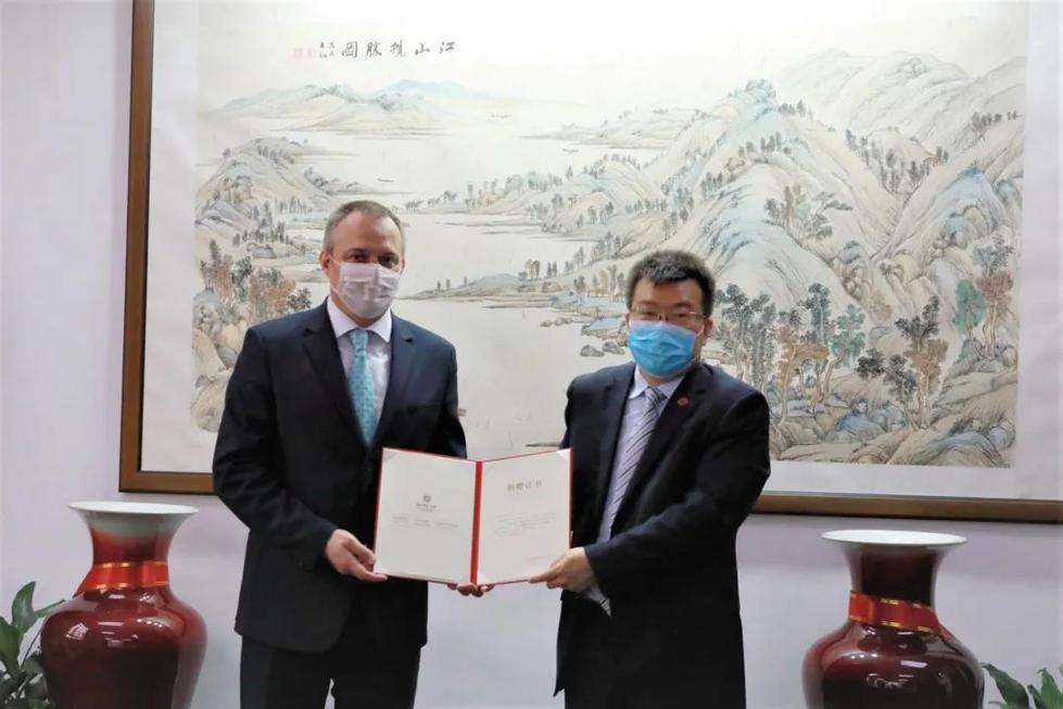 副校长孙真荣向白俄罗斯驻沪总领事安德烈·安德烈耶夫颁发捐赠证书