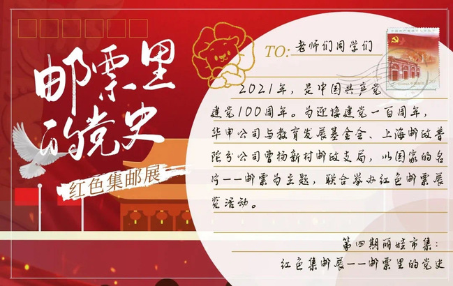 2021年,是中国共产党建党100周年。在迎接建党100周年之际,华申公司与华东师范大学教育发展基金会、上海邮政普陀分公司曹杨新村邮政支局,以邮票里的党史为主题,举办专题红色邮展。带领大家从国家的名片——邮票出发,方寸之间,重温党史。