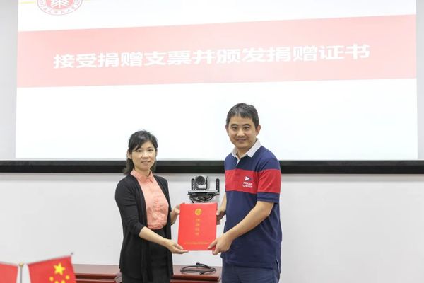 宛姝代表学校基金会接受捐赠支票并颁发捐赠证书