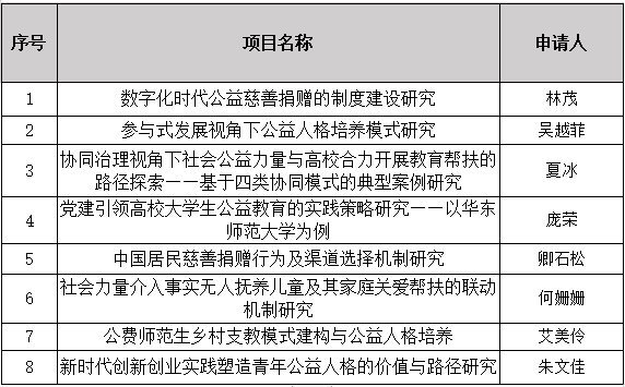 2023年度华东师范大学“紫江公益慈善研究专项基金”研究项目于2022年12月启动申报,共收到了19份项目申请,经华东师范大学公益慈善研究院组织校内外专家匿名通讯评审,并经研究院科研工作领导小组集体讨论决定,拟确定2023年度立项项目为8项。现将名单公示如下:
