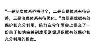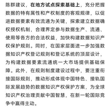随着新一轮科技革命和产业变革深入发展,数据作为数字经济时代不可或缺的新型生产要素,正逐渐成为经济高质量发展的重要支撑。“数字经济的发展离不开相关的治理体系。总体上看,我国数据治理体系建设已进入快车道,但也面临着不少挑战。”3月5日,全国政协、民盟中央副主席、上海市主委,上海市政协副主席陈群在接受记者采访时分析了数据产权保护面临的几大问题。