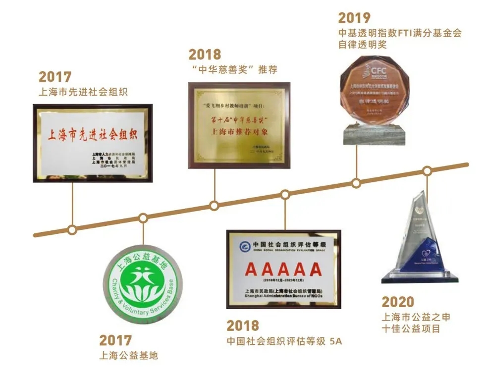 2018年,基金会获得5A社会组织认定,孵化的爱⻜翔品牌、紫江公益慈善人才培育项目分别获得 2018、2020公益之申校园十佳项⽬的荣誉。