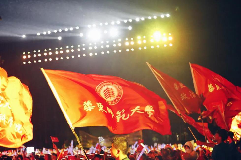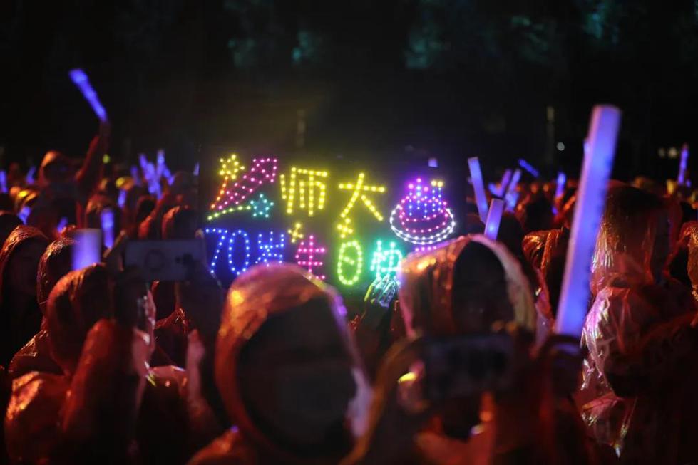 求实成就卓越,教育创造未来。由“穿越千机”无偿捐赠800架无人机飞行表演在演出尾声展现。璀璨升空,宛若繁星,照亮樱桃河的夜空。无人机编队飞行表演《华夏之光》,通过勾勒校门、群贤堂、校徽、70周年标识、荷花、幸福花狮等元素变化,祝福华东师大生日快乐。