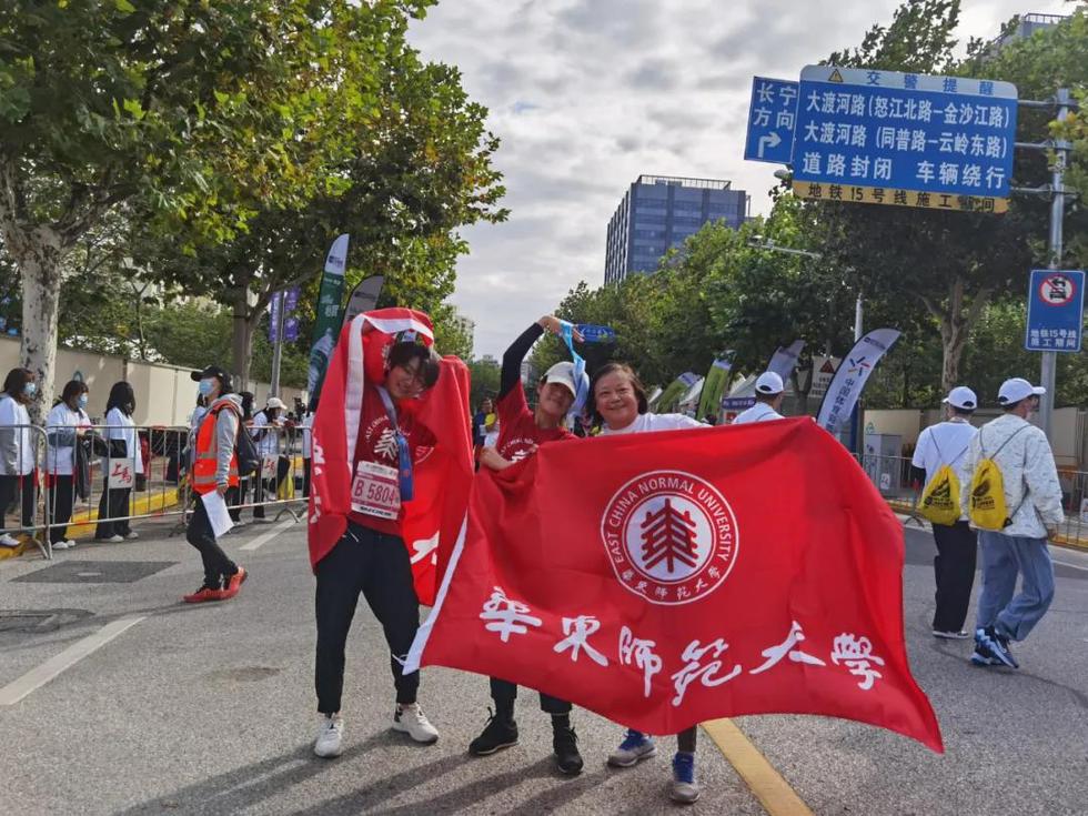 除了赛道上有华东师大跑者的靓丽身影,赛道旁也有华东师大人构筑的风景线。据了解,为增强凝聚力和集体荣誉感、彰显华东师大的形象和风采,华东师大跑团成员及志愿者都身着学校文化衫,并佩戴印有“求实创造,为人师表”校训等华东师大元素的绶带。