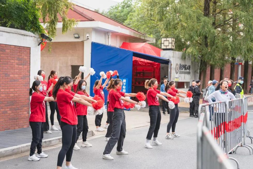 本次精英赛的10公里跑和6公里健身跑两个项目的赛道路段均经过华东师大枣阳路门,因此,助威团队及志愿者在“家门”前设置了特殊应援,健美操、啦啦操的难度动作表演引得阵阵欢呼喝彩;志愿者们在道路两侧手持旗子、横幅,在《爱在华师大》等音乐中为跑团成员加油助威。